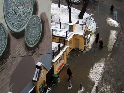 Anscheinend bin ich angekommen. Ich bin in Riga und sammle Eindrücke. Vieles ist ganz genauso wie ich es mir vorgestellt hatte, manches ganz anders. Das Zimmer> geht jedenfalls ganz klar als solches durch und in dem Bett konnte ich auch gut schlafen. Nach wie vor etwas beunruhigend finde ich die Tatsache, dass es pro Etage nur eine Dusche gibt. Heute musste ich zwar nicht all zu lange warten, aber offensichtlich versuchen die anderen Studenten schon gar nicht mehr, morgens zu duschen. Nicht auszudenken, was passieren würde, wenn sich alle früh um acht im Waschraum treffen würden. Ich wohne ganz oben im fünften Stock. Eigentlich ist es der vierte, aber die Letten kennen kein Erdgeschoss und fangen immer gleich mit der ersten Etage zu zählen an. Die Treppen machen mich jedes Mal fertig, einen Fahrstuhl gibt es natürlich nicht. Auf der Etage sind mindestens zehn Zimmer, vielleicht auch mehr. Den Luxus eines Einzelzimmers, der mir hoffentlich erhalten bleibt, leistet sich hier sonst keiner. Wie viele jeweils in den Zimmern wohnen, habe ich noch nicht herausbekommen. Hinsichtlich der Duschenknappheit hoffe ich, dass es nicht all zu viele sind. Es gibt außerdem noch eine Küche, die ich mir noch gar nicht richtig angesehen habe und drei Klos. Alles einigermaßen sauber und gut geheizt. Die Heizung kann man nicht ausstellen. Die Temperaturregulierung erfolgt über das mehr oder weniger weit geöffnete Fenster. Das erinnert mich schwer an eine Jugendherberge in London, in der ich jüngst verweilen durfte. Eingeweihte werden sich erinnern. Das Haus sieht von außen sehr massiv und seltsam aus. Ich weiß nicht, was das mal war. Man sieht ihm das Hostel, das es verbirgt, überhaupt nicht an. Nur die beiden oberen Etagen gelten als Studentenwohnheim, der Rest ist Hostel und entsprechend der Jahreszeit total leer. Ich habe heute versucht ein Foto von meiner Unterkunft> zu machen. Die beiden Fenster ganz oben, ganz rechts, wo es um die Ecke geht, sind meine. |