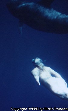 Die Pilotwale wurden mir die vertrautesten Delphine. Durch ihre Langsamkeit konnte ich ihnen in meiner Wahrnehmung folgen und meine eigenen Handlungen nachvollziehen. Oft wurde ich von ihnen regelrecht in ihren Daseinsraum entführt. Bei den Pilotwalen habe ich einen Zusammenhalt in ihren Schulen erlebt, den ich mir bei uns Menschen nur wünschen kann. Es gab in jeder Schule ein Leittier. Es war jeweils der größte, älteste und damit erfahrenste Wal in der Gruppe, der manchmal als Kundschafter voraus schwamm oder besonders neugierige junge Wale zurückpfiff, wenn sie mit dem Spielen aufhören sollten. Auffallend war auch, daß sich Gemütszustände von den Walen auf den Menschen übertragen konnten und möglicherweise auch umgekehrt. Einmal lag ich regungslos auf dem Wasser und dachte nichts. Der Wal in meiner Nähe wurde auch völlig regungslos. Immer wenn sie mich mitnahmen, in ihre Gruppe integrierten, standen sie untereinander in ständiger Verbindung. Entweder blieben sie in körperlicher Tuchfühlung, berührten sich mit den Spitzen ihrer Flipper, oder sie unterhielten sich über ihre Pfiffe. Vor allem Kerstin machte im Kontakt große Fortschritte. Sie entwickelte eine sehr sensible Wahrnehmung dafür, wann sie als Gruppenmitglied erwünscht war. Als sie einmal mit drei Walen zusammen war und es gleich klar war, daß sie sie gleich mitnehmen würden, schwammen sie so nah unter ihr, daß die kleinste Bewegung ausgereicht hätte, sie zu berühren. Doch dazu fühlte sie sich nicht eindeutig genug eingeladen. Sie konnte die hauchdünne Wasserschicht zwischen sich und den Walen körperlich spüren. Es gab Momente da war sie so in ihren Bewegungsstrom integriert, daß es nahezu synchrone Bewegungen gab, die der hohe Seegang noch unterstützte. Auch in dieser Situation schwammen die Wale meistens so, daß sie sich an Flippern und Finnen berührten.
