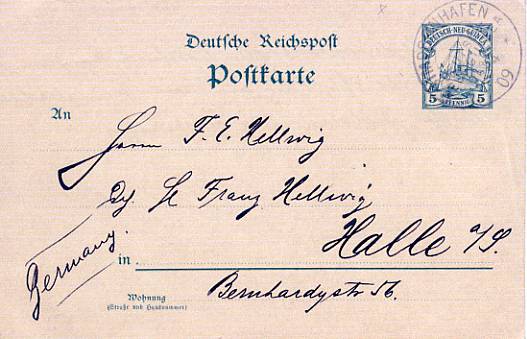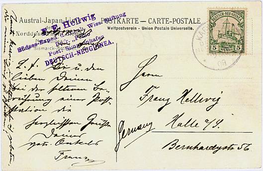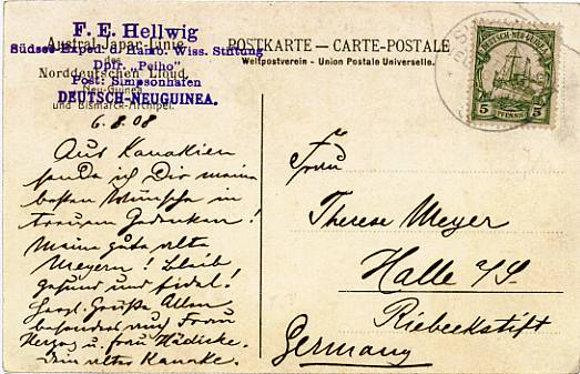 Abbildung 9: 6.8.08 Karte F. Hellwig, aus DNG, Simpsonhafen nach Halle. Am Tag vor dem ersten Auslaufen zur St. Matthias-Gruppe. Seltener violetter Absenderstempel "F. E. Hellwig, Südsee-Exped. d. Hamb. Wiss. Stiftung, Dpfr. "Peiho", Post Simpsonhafen, DEUTSCH-NEUGUINEA". Sammlung Hermann.
