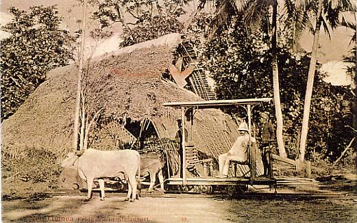 Abbildung 10: 9.10.08 Karte Franz Hellwig, Kaewieng nach Halle. Von der ersten Reise. Seltener violetter Absenderstempel "F. E. Hellwig, Südsee-Exped. d. Hamb. Wiss. Stiftung, Dpfr. "Peiho", Post Simpsonhafen, DEUTSCH-NEUGUINEA". Bildseitig: Feldbahn in Stefansort.