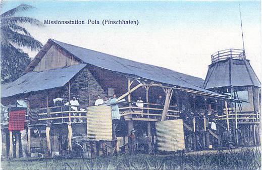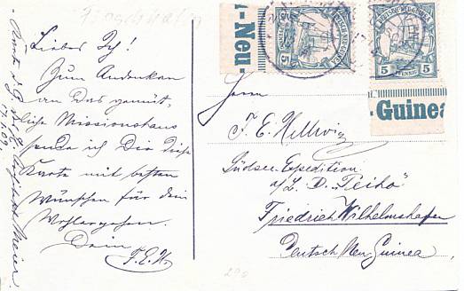 Abbildung 12: 17.4.09 Karte aus Finschhafen, DNG, an F. Hellwig. Herr Baumann schreibt zu dieser Karte: "Im Dezember 1908 - Frühjahr 1909 befand sich die Expedition im Huon-Golf und besuchte auch Finschhafen. Das gezeigte Gebäude war gleichzeitig die Postagentur von Finschhafen. Hellwig lässt sich seine selbst geschriebene Ansichtskarte von Fischhafen nach Friedrich - Wilhelmshafen nachsenden; durch Gefälligkeit des Architekten Meier. Dieser war wie Hellwig auch fanatischer Briefmarkensammler. Er betrog aber Sammler in Deutschland, die sich bei Dr. Hahl und dem Gericht in DNG beschwerten. Meier verschwand heimlich aus Deutsch Neuguinea. Sammlung Baumann.